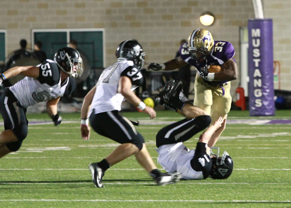PHOTO: Marble Falls High School junior running back Keith Jerome (right) muscles through the Vandegrift High School defense during the first half of the Mustangs’ homecoming game Oct. 19 at Mustang Stadium in Marble Falls. Photo by Diana Cox