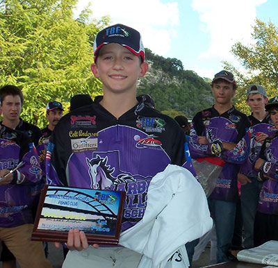 PHOTO 1: Marble Falls Bass Fishing Club member Colt Anderson shows the plaque he earned for winning the Fall Open fishing tournament on Nov. 3 at Lake Austin. He caught fish totaling 9 pounds and 3.5 ounces, including the Big Bass, which weighed 5 pounds, 15 ounces. Courtesy photos