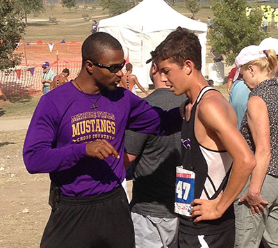 Marble Falls HIgh School cross-country head coach Anthony Torns (left) talks to junior runner Jordan Wright after he finished 53rd at the Class 4A state meet Nov. 10 in 17 minutes and 22 seconds. Wright is the first Mustang to return to the state meet since Olympian Leonel Manzano was there in 2003. Courtesy photo