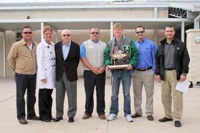 Burnet High School junior quarterback Derek Kiser is presented with the Built Ford Tough Texas High School Class 3A Player of the Week trophy he was awarded for his performance in the 62-34 victory against Llano on Nov. 2. Congratulating Kiser are Burnet offensive coordinator Andy McHazlett (left), Johnson Sewell Ford Lincoln representative Calli Curan, Johnson Sewell Ford Lincoln owner Ross Johnson, Johnson Sewell Ford Lincoln representatives Cory Courtney and Josh Milam and Burnet head football coach and athletic director Kurt Jones. Courtesy photo