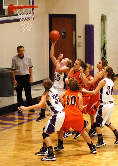 PHOTO: Marble Falls High School junior forward Haley Stephens scores two of her 14 points against Llano on Nov. 20. Courtesy photos