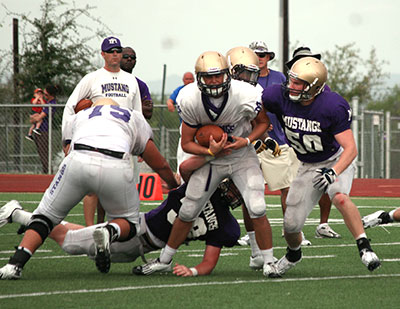 PHOTO: Marble Falls High School quarterback Mike Richardson (center) is tagged down by linebacker Brennan Parker (right) during the Mustangs’ intrasquad scrimmage Aug. 18. Both players have been chosen to participate in the Offense-Defense Bowl Week festivities Dec. 26-Jan. 1 in Houston. File photo