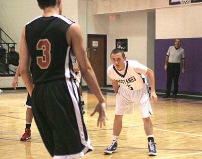 PHOTO: Marble Falls High School senior guard Joey Blackledge (right) prepares to defend the 3-point line during the Mustangs’ 54-50 loss to Austin Hyde on Nov. 29. Staff photo by Jennifer Fierro