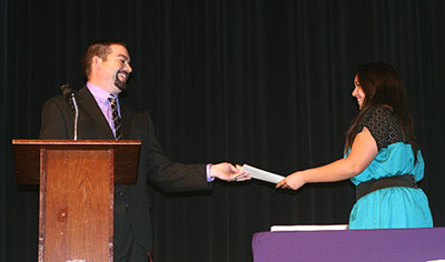 PHOTO 1: Marble Falls athletic trainer Alexandra Southworth accepts a special certificate for being a four-year trainer from head athletic trainer Brandon Belk during the falls sports awards ceremony on Dec. 6 at the Marble Falls High School auditorium. The other trainer was Baleigh Whitman. Staff photos by Jennifer Fierro