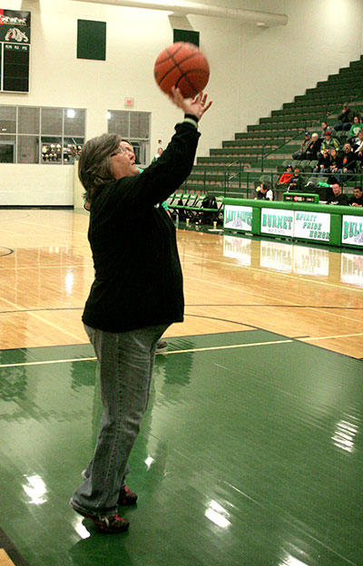 Burnet Consolidated Independent School District teacher Tammy Hullum makes the first of three shots to win $100 during halftime of the Burnet-Brownwood girls varsity basketball game Jan. 4. Hullum had 30 seconds to make a layup, a free throw and a 3-pointer. Staff photo by Jennifer Fierro