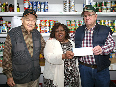 Burnet County Farm Bureau Director Macyl Orman (left) and secretary/treasurer Ray Cagle (right) deliver a $400 check to Marble Falls Helping Center Executive Director Sue Kennedy on Feb. 18 as part of an annual campaign promoting the basic food staples to battle hunger. The local farm bureau also donated $400 to LaCARE in Burnet and another $400 to a food bank that serves the Briggs area. Staff photo by Connie Swinney