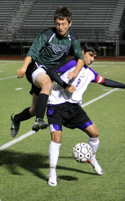 Marble Falls High School senior forward Danny Osornio (right) tries to retain control of the ball. Photo by Kelly McDuffie