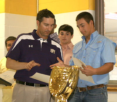 Marble Falls High School head baseball coach J.T. Blair (left) gives senior shortstop Stacy Heinatz his certificate for being a unanimous first-team, all-District 25-4A selection. Staff photo by Jennifer Fierro