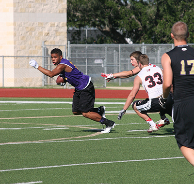 The Marble Falls High School 7-on-7 football team competed against Lake Travis on June 10, winning both games. Marble Falls freshman Davin Manning (right) moves away from a tag during the Mustangs first victory, a 40-38 decision. The Mustangs won the second game by three touchdowns. Staff photos by Jennifer Fierro
