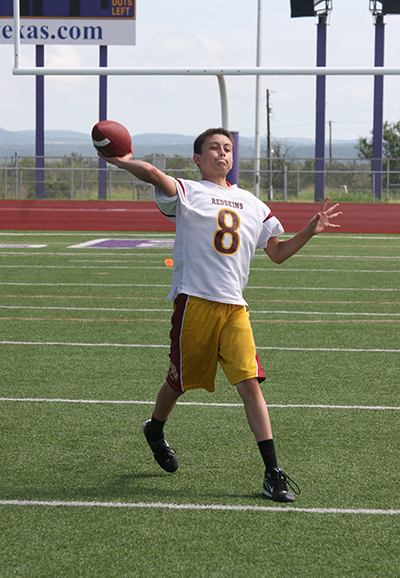Quarterback Raul Guzman, 13, is about to complete a pass.