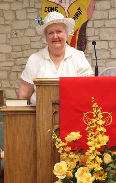 Wearing her bluebonnet-adorned hat, Sister Barbara Crockett enjoys a four-week Methodist minister exchange program at Highland Lakes First United Methodist Church in Buchanan Dam. Crockett’s home churches are in Stoke-on-Trent in England. Highland Lakes FUMC’s pastor, the Rev. Grady Roe, is tending Crockett’s flocks. Staff photo by Daniel Clifton