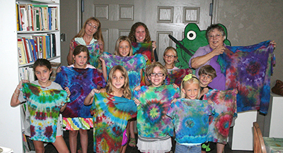 ArtFrog Art Academy students show off their finished tie-dyed shirts July 12 at the academy’s new location in Marble Falls. Pictured are Isabelle Nash (front, left), Leah Nash, Meredith Farley, Lily Youngquist; Megan McVeigh (middle, left), Ashley Youngquist, Emma Youngquist, Aidan McVeigh; Jan Shapland (back, left), Mattie Cryer and Judy Tull. Staff photo by Jared Fields
