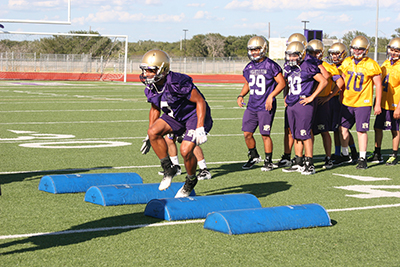 Marble Falls High School football player Daven Manning works on balance, footwork and quickness during the Mustangs first day of fall training camp Aug. 12.