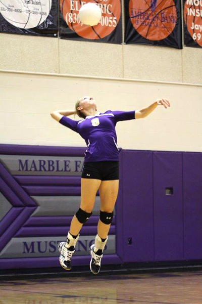 Marble Falls High School senior libero Lacie Long (center) spikes the ball. Photo by Gary Thomas/MFHS volleyball