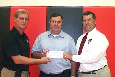 American Bank of Texas’ senior vice president and market manager for the Highland Lakes, J. Don McAlpin (center), presents a donation for $6,944 to Faith Academy of Marble Falls athletics director Jesse Crow (left) and administrator Mark Earwood to purchase a scoreboard that will be placed in The Fire Pit gymnasium Aug. 27. ‘American Bank of Texas has been a proud supporter of Faith Academy academics and athletics since the inception of the school,’ McAlpin said. ‘We are glad to continue to support the Flames through this donation and purchase of the gymnasium scoreboard.’ Staff photo by Jennifer Fierro