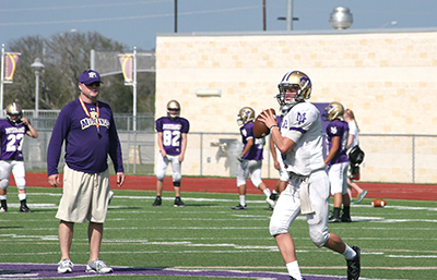 Marble Falls High School sophomore quarterback Brennen Wooten squares his shoulders before throwing as head coach Todd Dodge (left) watches. Wooten will get the start for the Mustangs as they face La Grange in the 2013 season-opener at 7:30 p.m. Aug. 30 at Leopard Stadium in La Grange. The Leopards also have a new quarterback in Dillon Davis. Staff photo by Jennifer Fierro