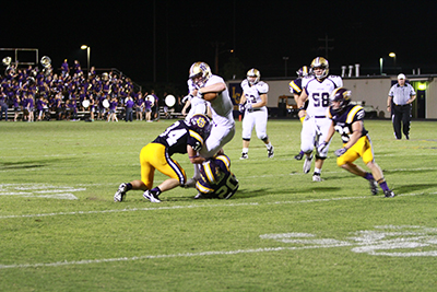 Marble Falls High School senior receiver Garrett Gray is tackled during the second half in a 49-23 loss to La Grange on Aug. 30 to open the 2013 football season. Gray finished with five catches for 74 yards and a touchdown. Sophomore quarterback Brennen Wooten was 26-of-49 passing for 252 yards with a touchdown and an interception. Photo by Diana Cox