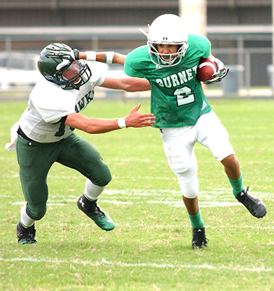 Burnet Middle School eighth-grader Michael ‘Mini-Vinny’ Rivera uses a stiff arm to get away from a Canyon Lake tackler during the Bulldogs’ 33-0 loss Sept. 19. The player received his nickname because of former Burnet standout Vincent Rivera, his older brother. Courtesy photo