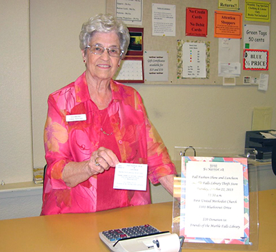Fayrene Teague, a cashier at the Library Thrift Store, located at Third Street and Avenue J in Marble Falls, is selling tickets for the Fall Fashion Show and Luncheon at 11:30 a.m. Oct. 22 at First United Methodist Church, 1101 Bluebonnet Drive in Marble Falls. Courtesy photo