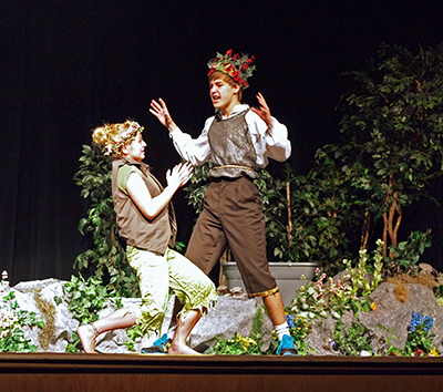 Marble Falls High School theater arts students MaeAnn Ross (left) as Puck and Wolf Williams as Oberon rehearse for the upcoming production of 'Shakespeare in Hollywood.' The play tells the story of two of Shakespeare's fairies from 'A Midsummer Night's Dream' who end up in the middle of a 1930s Hollywood production of the silver-screen version of the play. Staff photo by Daniel Clifton