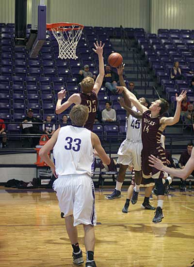 Marble Falls High School senior guard Zuri Buchanan (45) drives to the basket that is being defended by Dripping Springs senior post Patrick Bullock (33) and senior guard Bryce Hegemier. Staff photo by Jennifer Fierro
