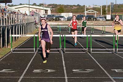 Marble Falls High School sophomore Natalie Schulz (left) wins in the 300-meter hurdles at the Bulldog Relays at Burnet High School on Feb. 28. Photo by Diana Cox