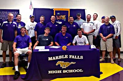 Marble Falls High School senior lineman and tight end Hanner Shipley (seated, third from left) signs his financial aid package to play football for Louisiana State University while he's surrounded by teammates Brennen Wooten (seated, left), Aaron Wooten and Jacob Metcalf and Marble Falls High School coaches Kyle Futrell (standing, left), Matt Williams, Kerry Graham, Robbie Coplin, Mike Birdwell, Ricky Sparks, high school principal Manny Lunoff, coaches Travis Chrisman, Chad Bishop, Jake Birdwell, Tim Hulon (partial view), Chuck Cook and Scott Johnson. Courtesy photo