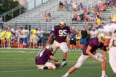 Marble Falls High School senior defensive lineman Melvin Sanchez attempts a field goal as senior Tyler Ryan holds the ball during the Mustangs’ scrimmage against Kerrville Tivy on Aug. 22. Photo by Diana Cox
