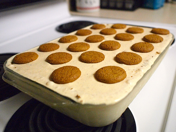 After stirring it up thoroughly, I poured it into a baking dish lined with gingersnap cookie crumbs. Now, I did sample the gingersnaps for quality-assurance purposes only. Then I poured half the pumpkin ice cream over those crumbs; added another layer of crumbs; and topped it off with the rest of the ice cream.