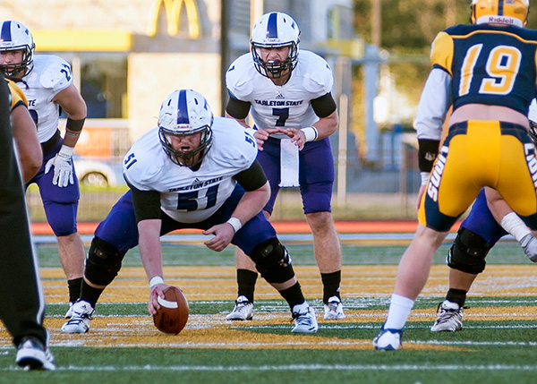 Tarleton State University sophomore quarterback Zed Woerner (7) calls for the ball from senior center Will McLane. Woerner, a former Marble Falls High School quarterback, set a single-game passing record for the Texans in a 56-49 loss to Texas A&M University-Commerce on Nov. 8. Photo by Jeff Smith/TSU Athletic Communications