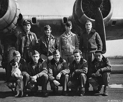 Then 1st Lt. Samuel Smith (back, left) stands with the crew of his B-17 Flying Fortress ‘Jackie’ on Feb. 4, 1945, during World War II. The crew included Smith, 2nd Lt. Arthur S.C. Shanafelt Jr., F/O Russell Knudson, Staff Sgt. Earl Lawson, Staff Sgt. Walter Geyer (front, left), Tech Sgt. Robert Bridgman, Staff Sgt. Jens Jensen, Sgt. Michael Kucab and Tech. Sgt. Thomas Zenick. The ‘Jackie’ crew flew 24 missions over Germany and France. Smith, who lives in Fredericksburg, is scheduled to attend the 2015 Bluebonnet Airshow on April 25 where organizers and attendees will recognize and honor the former World War II pilot. Photo courtesy of 33rd Bombing Group Association
