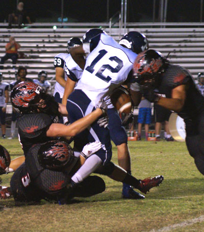 Faith Academy linebacker Caleb Todd tackles a Texas School for the Deaf player during the Flames' loss Sept. 25. Photo by Paloma Ortiz