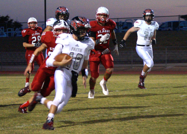 Faith Academy of Marble Falls senior quarterback Rich Coleman runs for positive yards during the 40-0 loss to San Antonio St. Paul on Sept. 4. Photo by Paloma Ortiz