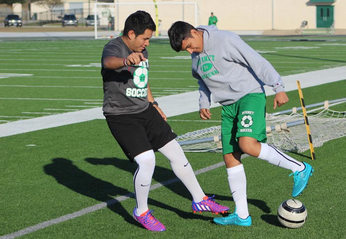 Burnet junior forward Carlos Silva applies light defensive pressure to sophomore wing Jose Gonzales. Staff photo by Jennifer Fierro