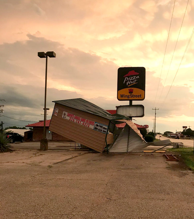 A display metal building in Llano crashed into a pole supporting a Pizza Hut sign due to high winds during a storm June 9, 2019. Photo courtesy of Gilbert Bennett