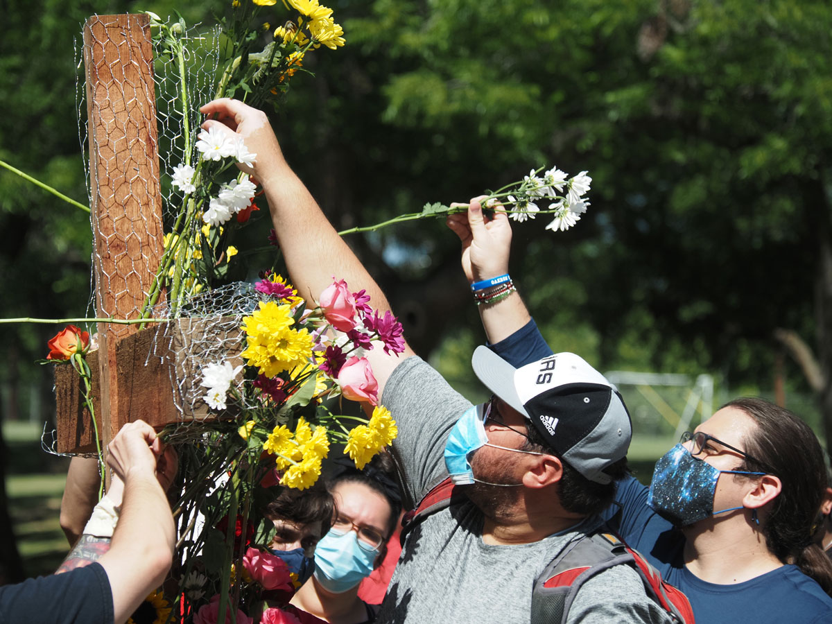 The peaceful protest included a Unity March from the park down Main Street in Marble Falls and back. There was also 9 minutes of silence as people placed flowers on a wooden cross. The silence corresponded with the amount of time a Minneapolis police officer had his knee on the neck of George Floyd, leading to his death.