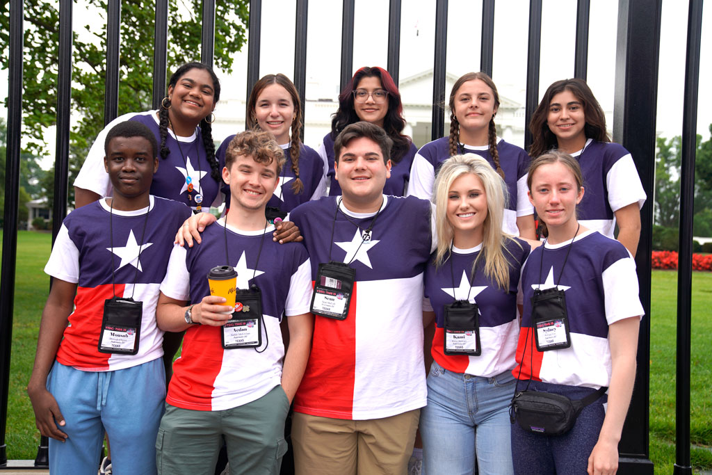 Kamball Stewart (front, second from right) of Marble Falls High School and Aedan McLennan (front, second from left) of Burnet High School participated in the 2023 Pedernales Electric Cooperative Youth Tour this past summer in Washington, D.C. PEC is taking applications for the 2024 tour through Jan. 4. Courtesy photo