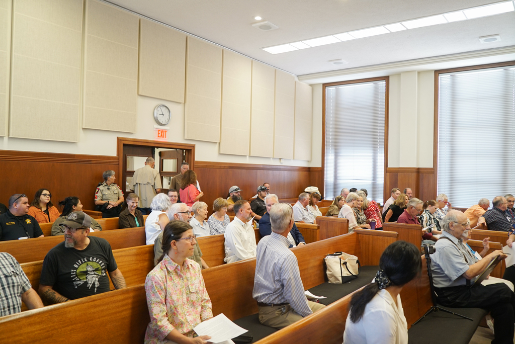 People packed the Burnet County Courthouse courtroom during the commissioners’ regular meeting on Tuesday, Aug. 13. Many lined up at a podium and some spoke from their seats to express their concerns about the raises, an issue the court has struggled with for weeks
