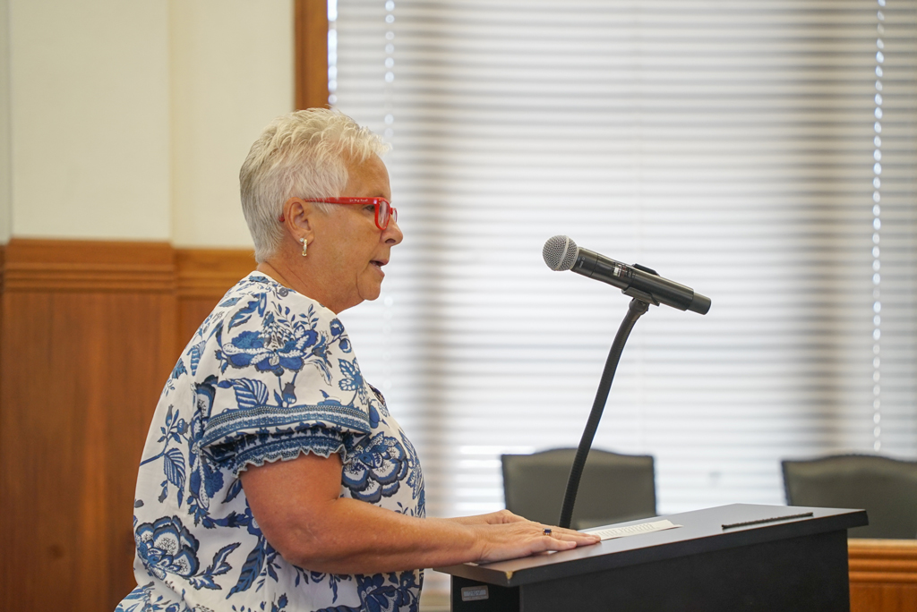 Burnet County resident Candy Ratliff was one of many residents who took to the podium on Aug. 13 during the regular meeting of the Commissioners Court to protest proposed maximum salary increases. Staff photo by Dakota Morrissiey