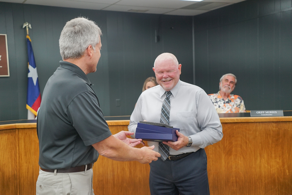 Outgoing Mayor Dave Rhodes accepts a plaque from Place 6 Councilor Craig Magerkurth. Rhodes left the mayor’s seat after eight consecutive years of service on the council, having termed out in 2025. Staff photo by Dakota Morrissiey