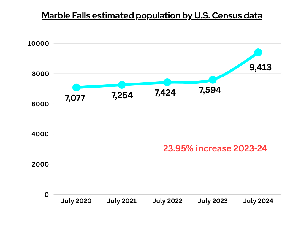 According to the latest census numbers, Marble Falls’ estimated population jumped from 7,594 in July 2023 to 9,413 in July 2024, a 23.95 percent increase in just one year.
