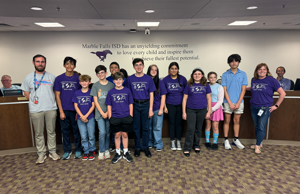 The team won Division State Champion for Middle Schools for the events that are Unique to Texas (not national events). Marble Falls Middle School students earned seven first places in events in the Unique to Texas category.