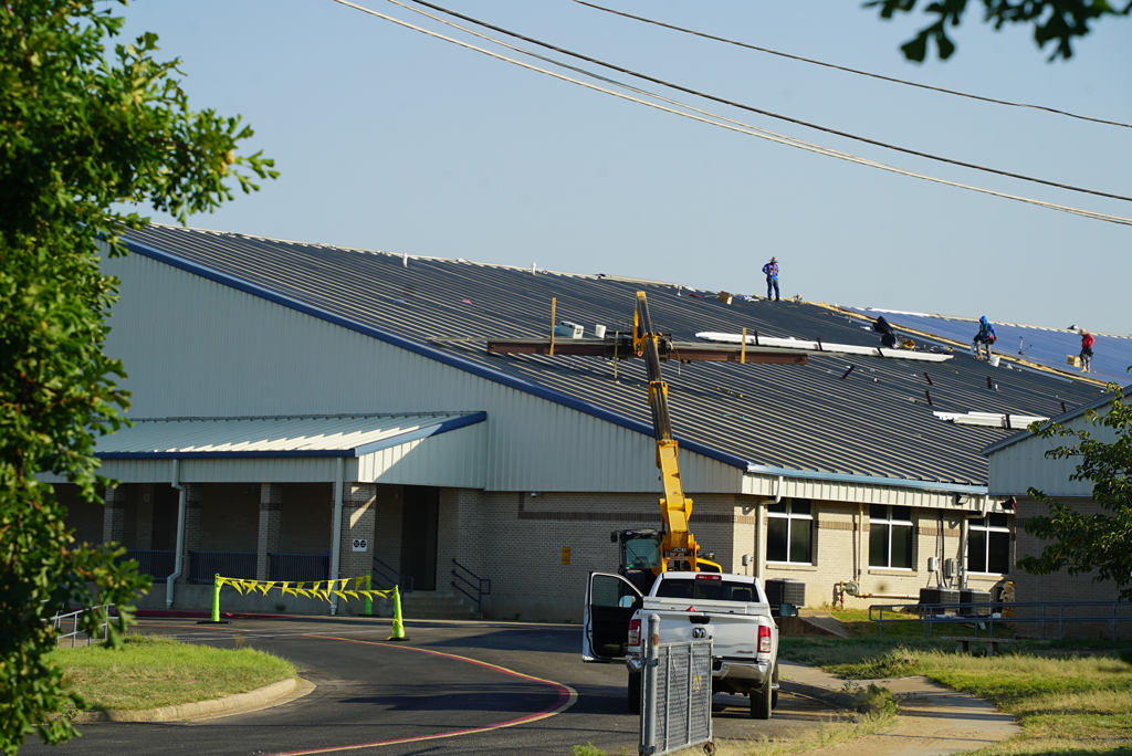 Work crews are busy making repairs to the roof of Marble Falls Middle School, which has been in need of maintenance for years. The fix is thanks to funding from the Marble Falls Independent School District’s $172.2 million bond package that was approved in May. Staff photo by Dakota Morrissiey