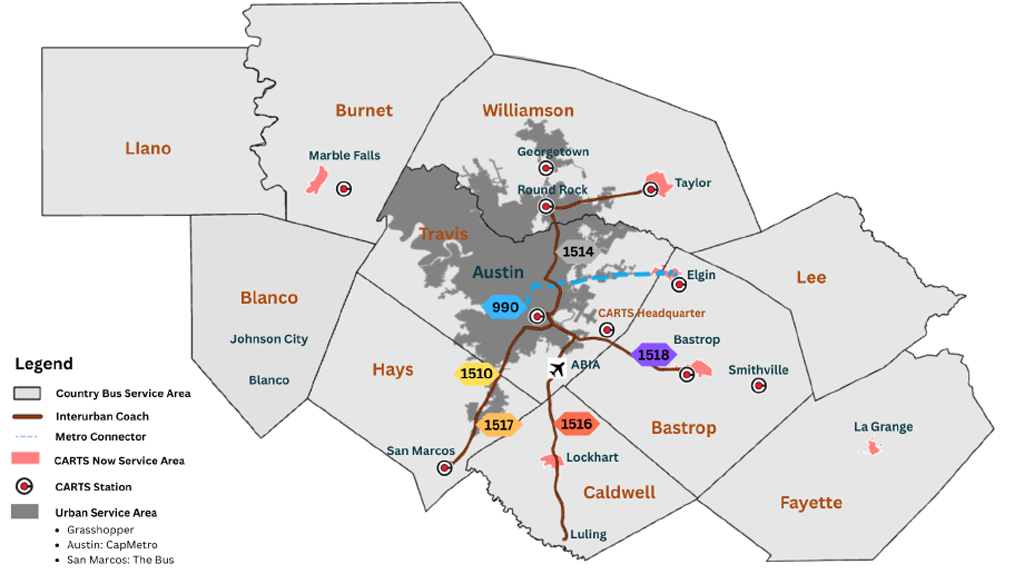 - plan seamless multimodal trips across Central Texas using the Transit App, which includes all CARTS services like Country Bus, CARTS NOW, 990 Metro Connector, and Interurban Coach, plus rideshares, electric bikes, CapMetro routes, and other local transit options;