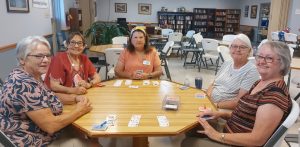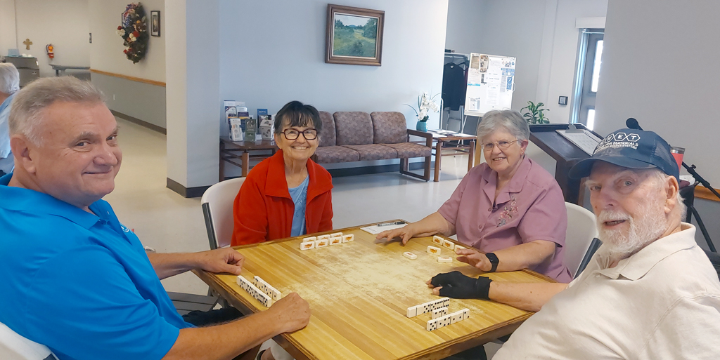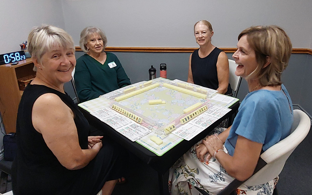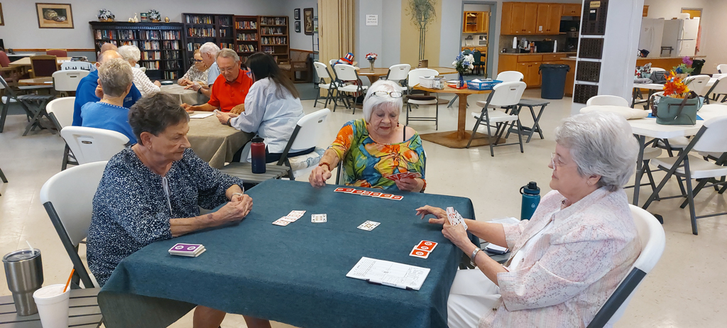 Party bridge is on Tuesdays. Mahjongg is played twice a week: tournament style on Mondays and a social game on Thursdays. Bring your favorite dish to share for a potluck on Fridays at noon. Canasta, 42, and straight domino tournaments are scheduled for Saturdays.