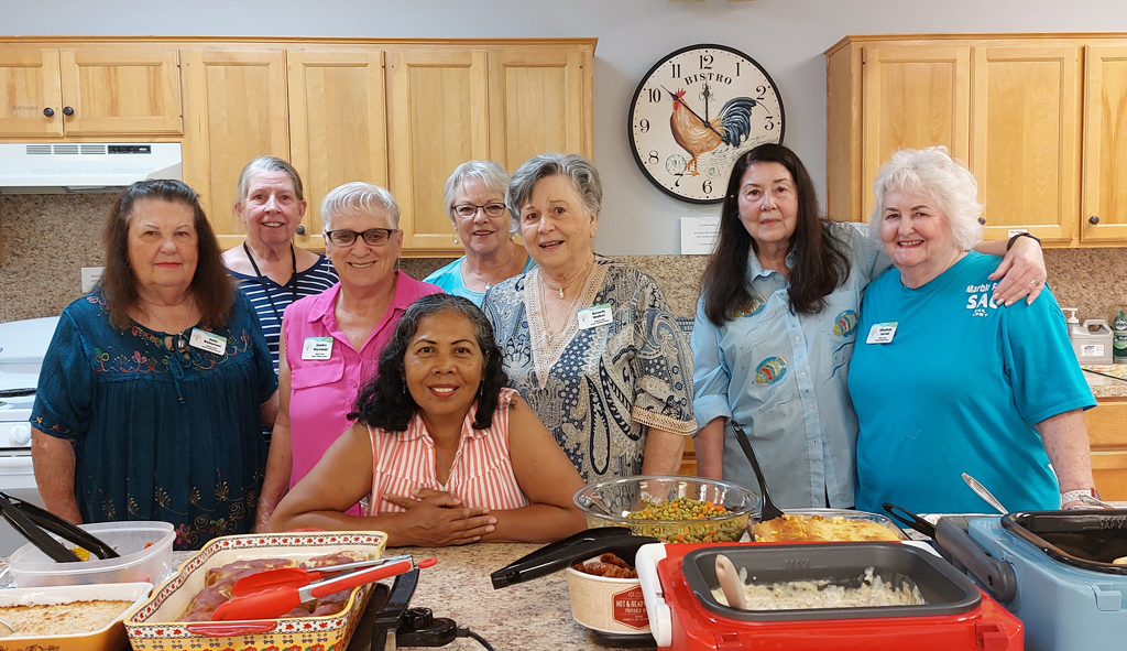 Gula Roberson, Valerie Ginsberg, Sandra Morowski, Aysash Lewis, Joyce McConahy, Beverly Walker, Julia Fisher, and Elizabeth Carroll help with a potluck meal at the Marble Falls Senior Activity Center. Courtesy photos