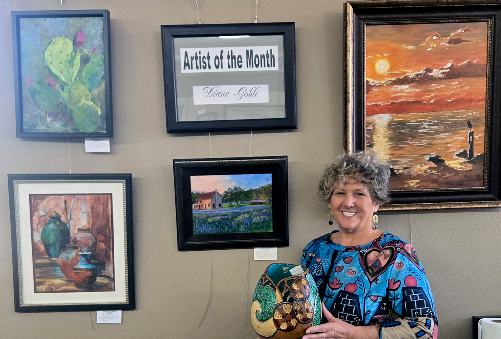Dianna Goble is the artist of the month for October at the Highland Arts Guild and Gallery in Marble Falls. She is an artist instructor, specializing in Hill Country landscapes, figures/portraits, and still life and enjoys guiding students in developing their creative voices. The multi-talented Goble excels in paper/canvas and gourd art and accepts commissioned work. Her art reflects the beauty of the Hill Country and the study of people and objects, capturing their form, light, and spirit. See her work at the gallery, 318 Main St. in Marble Falls. Learn more about the Highland Arts Guild at highlandartsguild.org. Courtesy photo