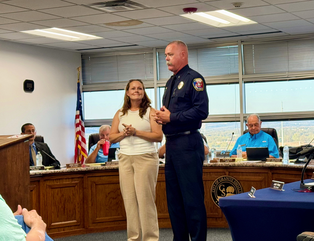 Jerry Duffield was officially sworn in as assistant fire chief of the Granite Shoals Fire Department during the Tuesday, Oct. 14, meeting of the City Council. Fire Chief Tim Campbell administered the oath, with Duffield’s wife by his side for the ceremony. Staff photo by Maci Cottingham