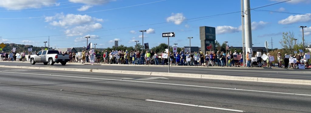 Hundreds of protesters lined the U.S. 281 bridge in Marble Falls on Saturday, Oct. 18, as part of a ‘No Kings’ demonstration. Photo courtesy of Burnet County Democrats
