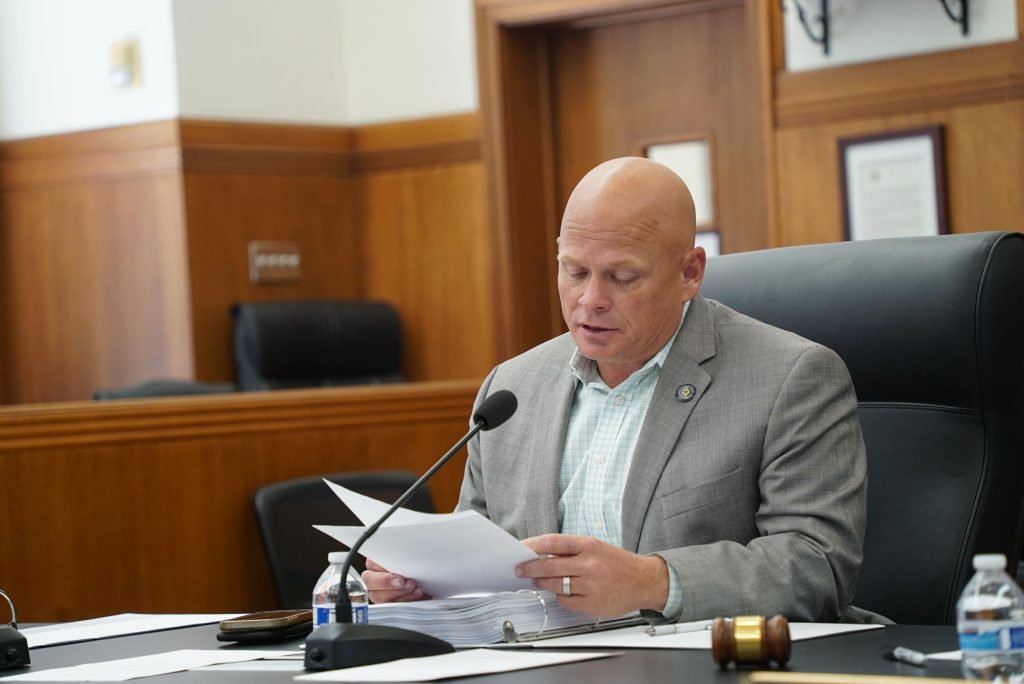 Burnet County Precinct 2 Commissioner Damon Beierle reads a resolution voicing the county’s concerns, questions, and requests regarding a proposed state transmission line project that would have a serious impact on landowners. Staff photo by Dakota Morrissiey